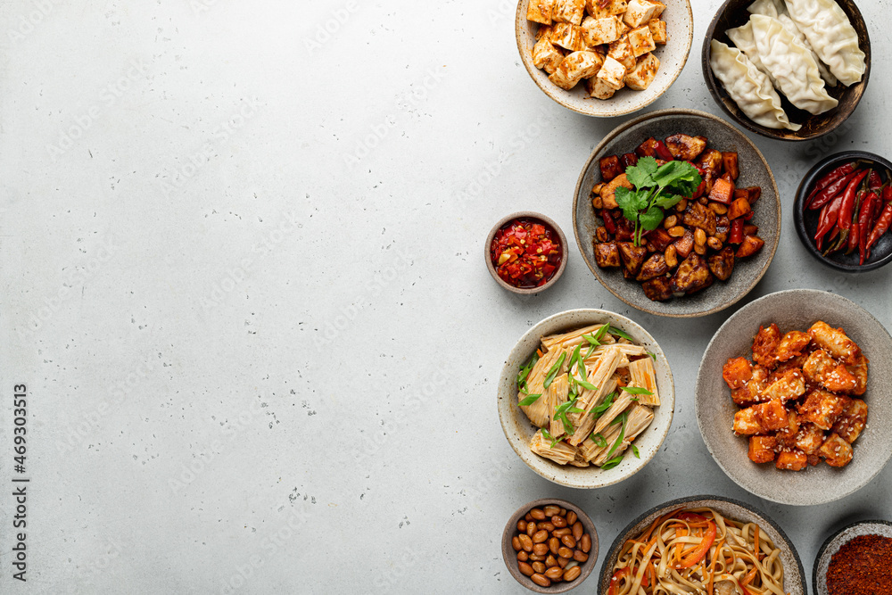 chinese food, chinese traditional cuisine dishes on a light concrete background, top view, copy space