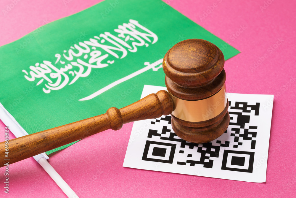 Judge gavel, barcode sheet and Saudi Arabia flag, concept of administrative punishment for violation of the regime using QR codes