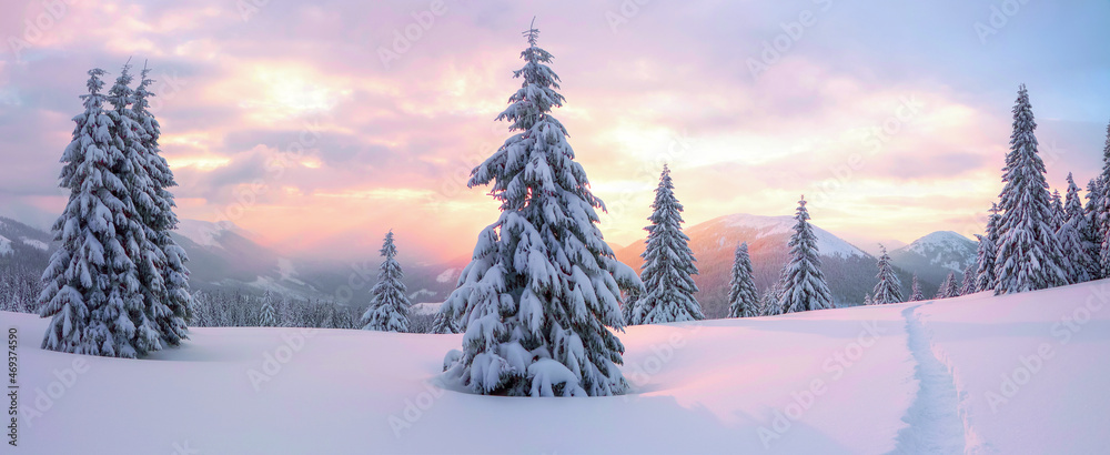 A panoramic view on high mountain. Winter forest. Amazing sunrise. Lawn covered in snow. Natural landscape with beautiful sky. Snowy background. Location place the Carpathian, Ukraine, Europe.