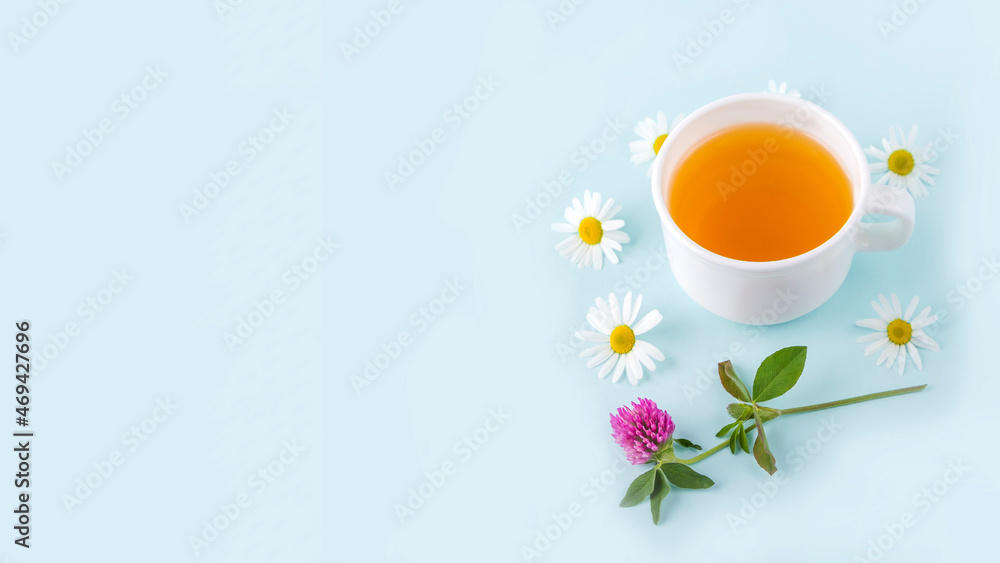 Cup of herbal tea with flowers chamomile on blue background, with copy space for text. Organic floral, green asian tea. Herbal medicine at seasonal diseases and treatment of colds, flu, heat