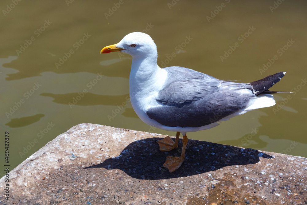 The adult yellow-legged seagull stand near the water at the sunny day.