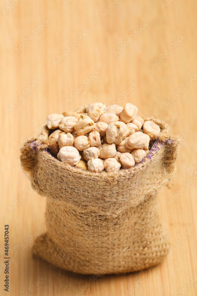 Dry chickpea in bag on wooden background.