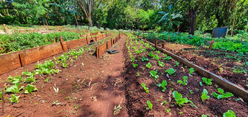 Growing plants. Plantation with various vegetables on farm in sunny day. Space for text.