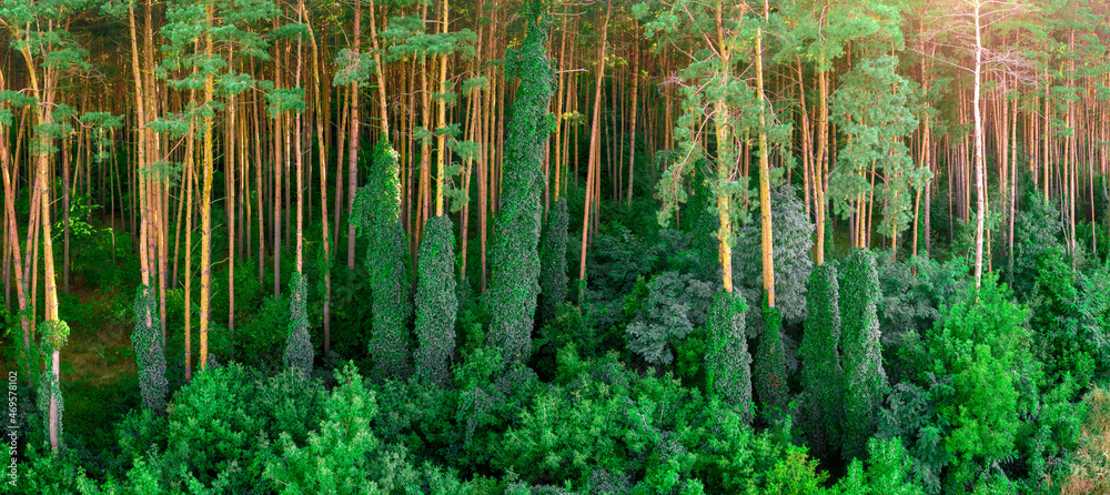 Natural background. Pine forest with braided twisted plants and tree trunks.
