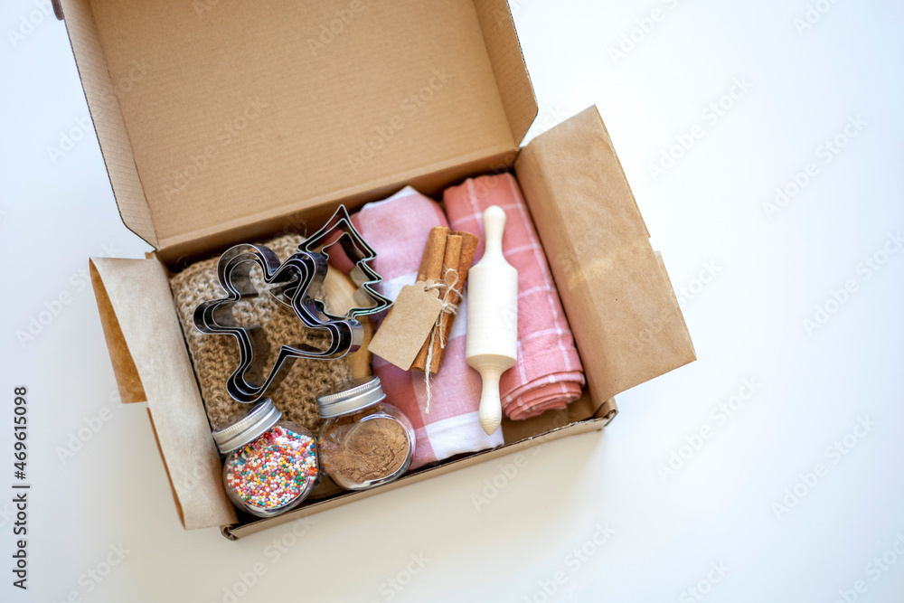 Preparing care package christmas. Seasonal gift box with items for making Christmas cookies.