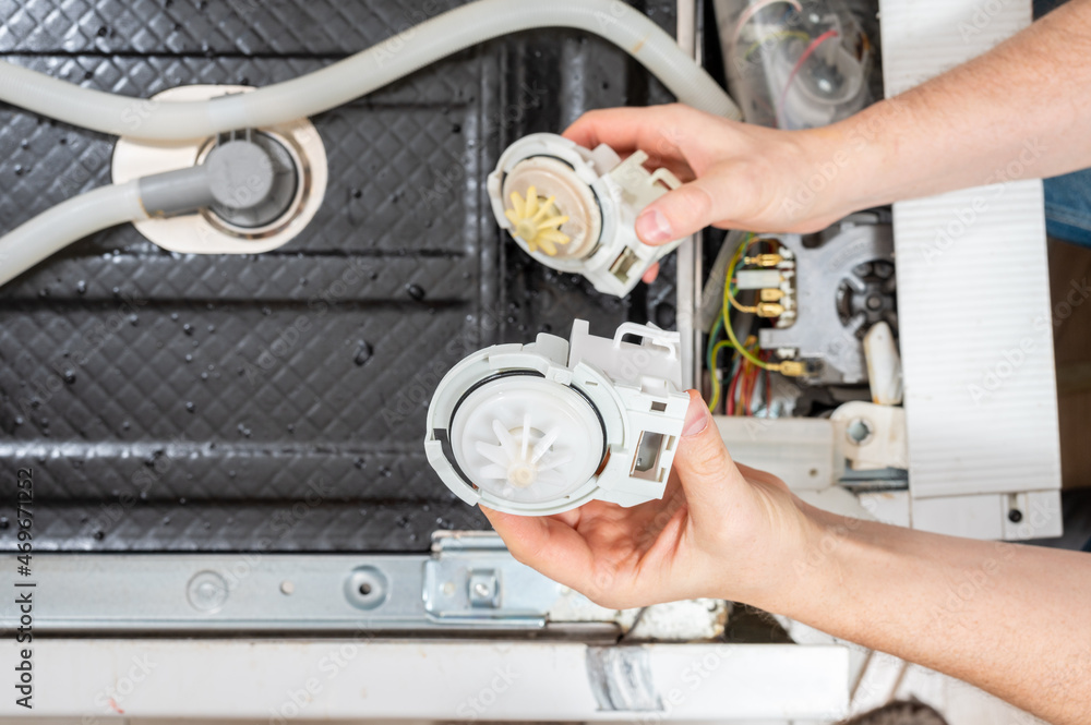 A new and old pumps for dishwasher in the hands of a men, against the background of a disassembled dishwasher