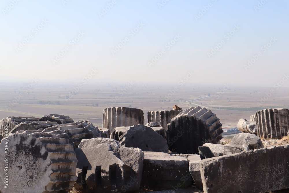 Scenic view with marble column fragments in archaeological site Priene in Turkey