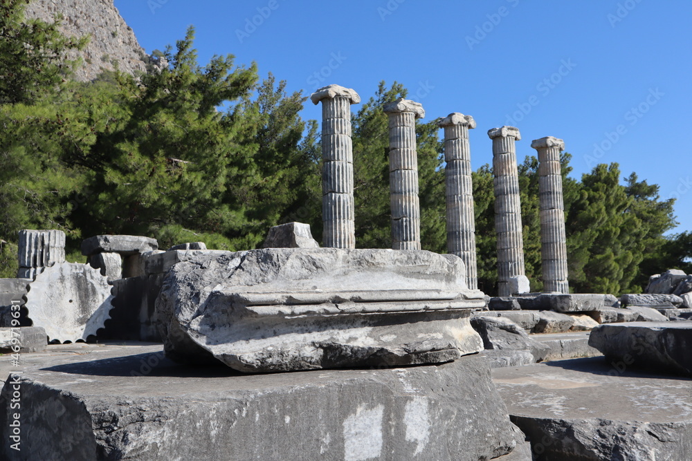 view to the ruins of ancient temple of Athena in archaeological site Priene, Turkey with marble column fragments on the foreground