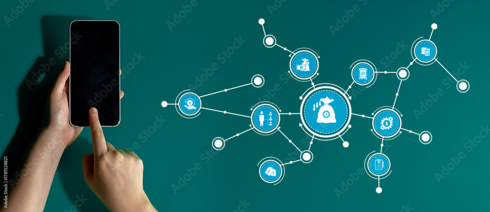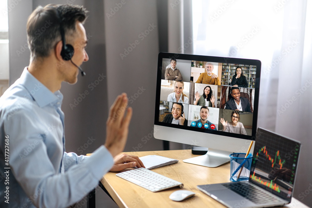 Male doctor in a white coat in a modern clinic reads information from a mobile phone corresponds with colleagues happy and smiles