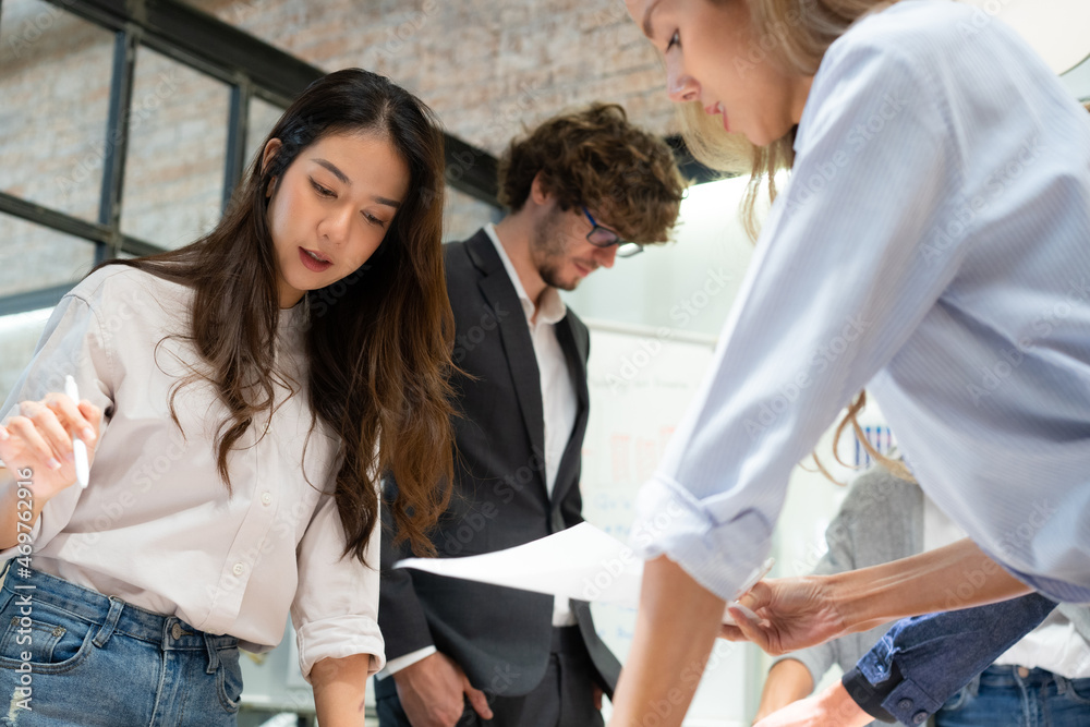 A group of young active business people, Caucasian and Asian, man and women standing looking at papers on table, brainstorming planning for a new project together during a meeting in a modern office.