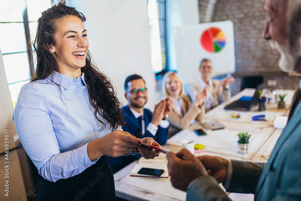 Businesswoman receiving award from businessman in front of business professionals, applauding at business seminar in office building