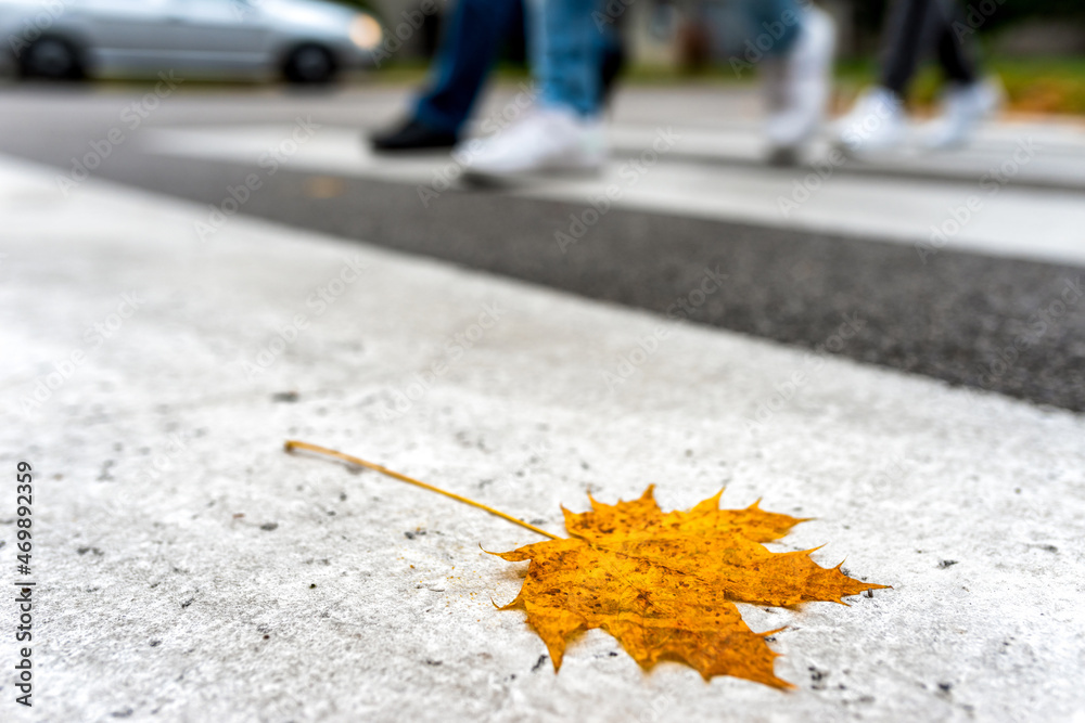 Yellow maple leaf lying on a pedestrian crossing. Legs of people on crosswalk. Autumn in city