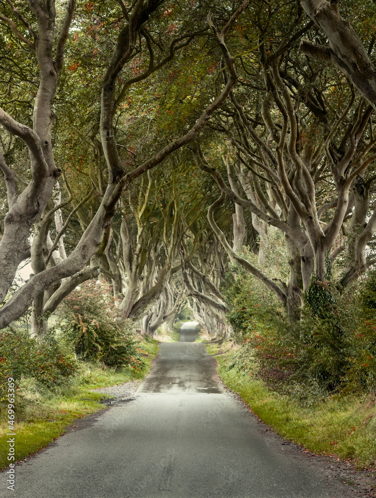 Early Autumn landscape of Road through the Dark Hedges a unique beech tree tunnel road n Ballymoney, Northern Ireland. Game of thrones location
