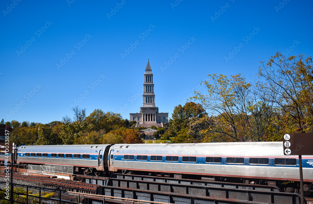 Alexandria, Virginia, USA - November 1, 2021: King Street - Old Town WMATA Metro Station, looking at the George Washington Masonic Temple, with an Amtrak Train in the Foreground on a Fall Afternoon