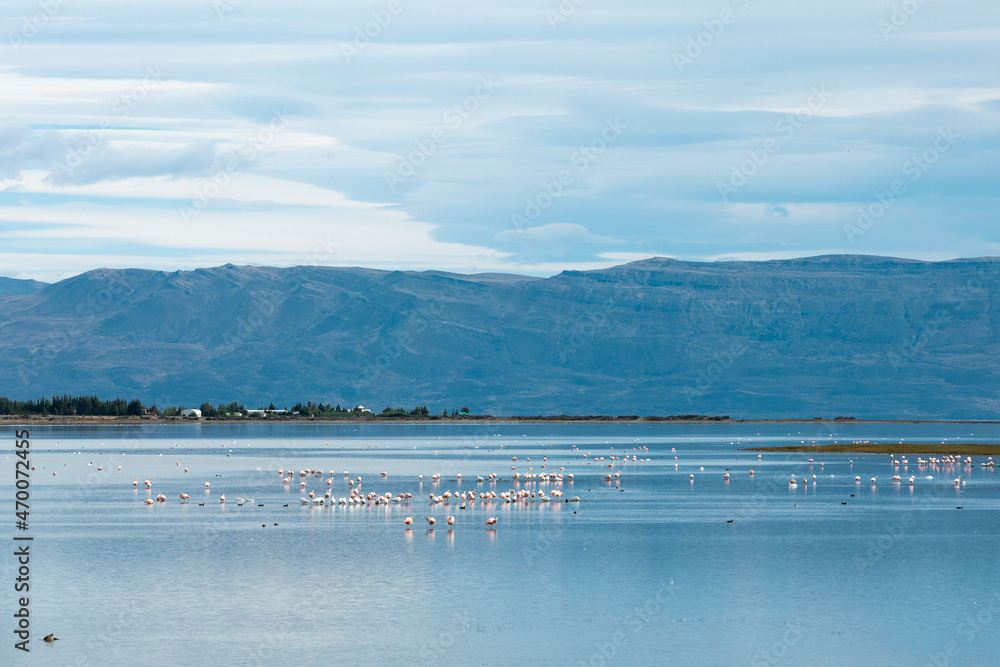 Pink flamingos eating plankton in the Lago Argentino in El Calafate