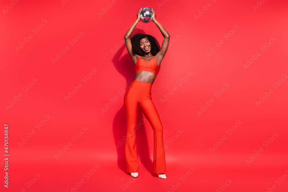 Full body photo of pretty cheerful lady hands hold discoball enjoy free time isolated on red color background