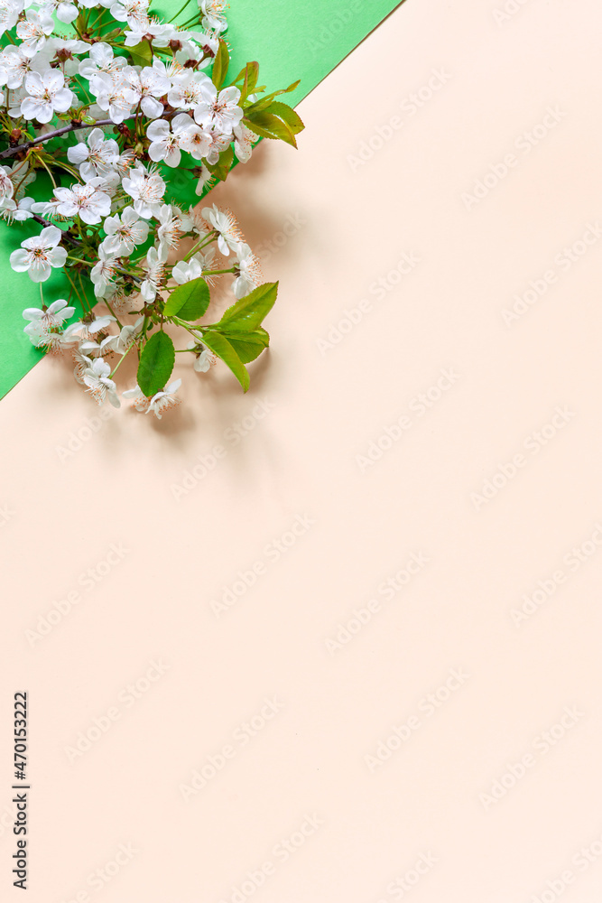 Close-up photo of Beautiful white Flowering Cherry Tree branches. Wedding, engagement or betrothal concept on Calming Coral background. Top view, greeting card