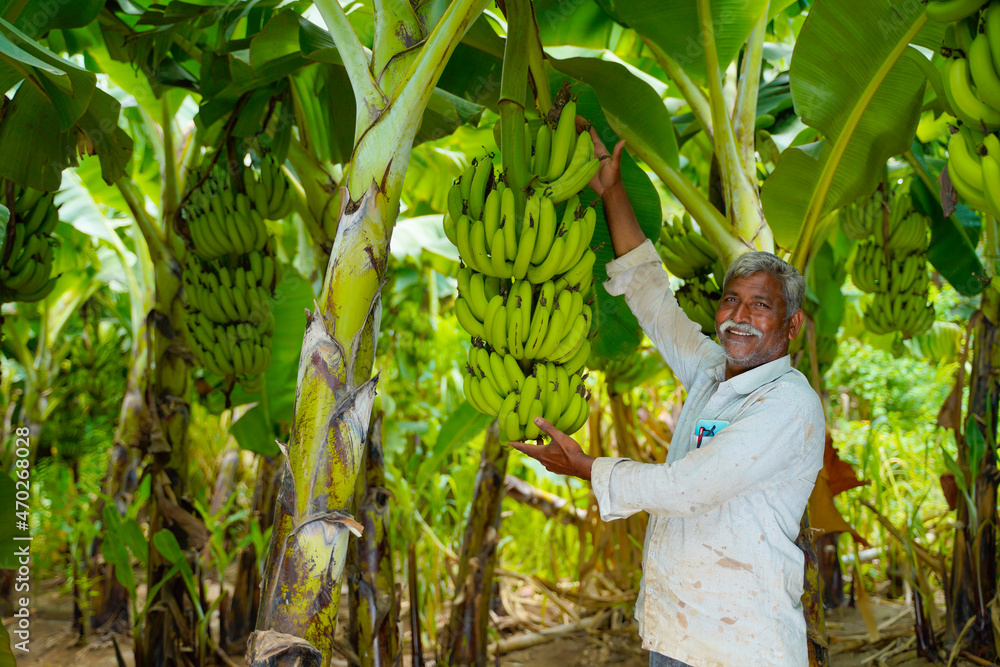 Young Indian farmer at banana agriculture field.