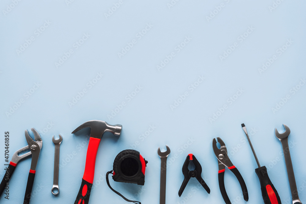 Working tools hammer, screwdriver, pliers, spanner and meter on light blue background, top view, flat lay