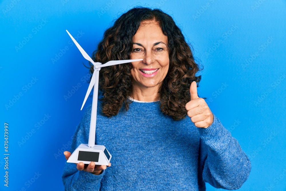 Middle age hispanic woman holding solar windmill for renewable electricity smiling happy and positive, thumb up doing excellent and approval sign