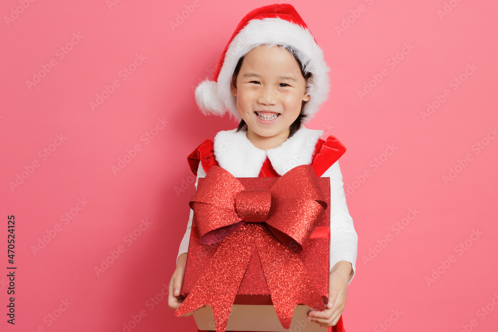 smiling young girl holding gift box stand in front of pink background