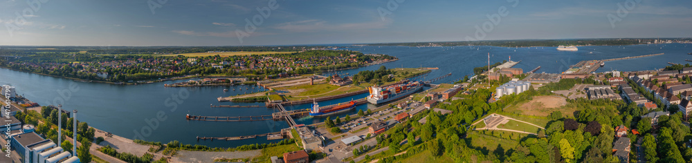 Aerial view of moored ships on the lock.Cargo ships pass the Holtenau lock of the Kiel Canal. Aerial view of the Kiel Canal waterway with lockage Holtenau and Kieler Förde.