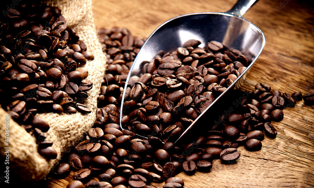 Kaffeebohnen geröstet im Sack mit Schaufel