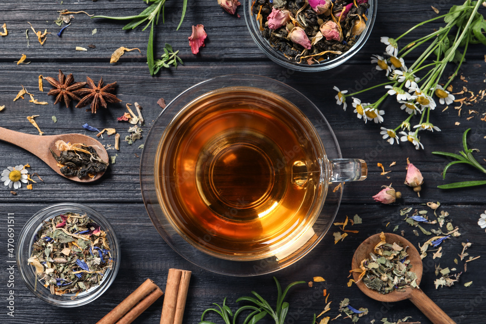 Flat lay composition with freshly brewed tea and dry leaves on black wooden table