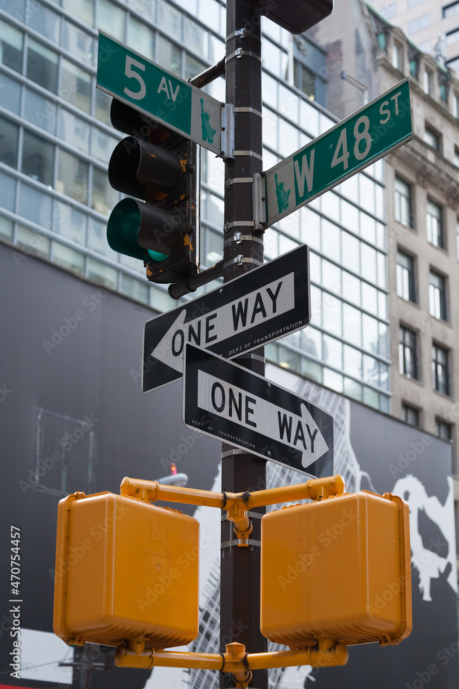 Street signs at the corner of West 48th Street and 5th Avenue in Manhattan