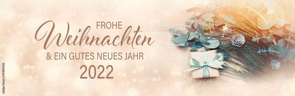 Christmas card with German text. Merry Christmas and Happy New Year 2022 . Christmas present - gift box with fir branch. Frohe Weihnachten und ein gutes neues Jahr 2022