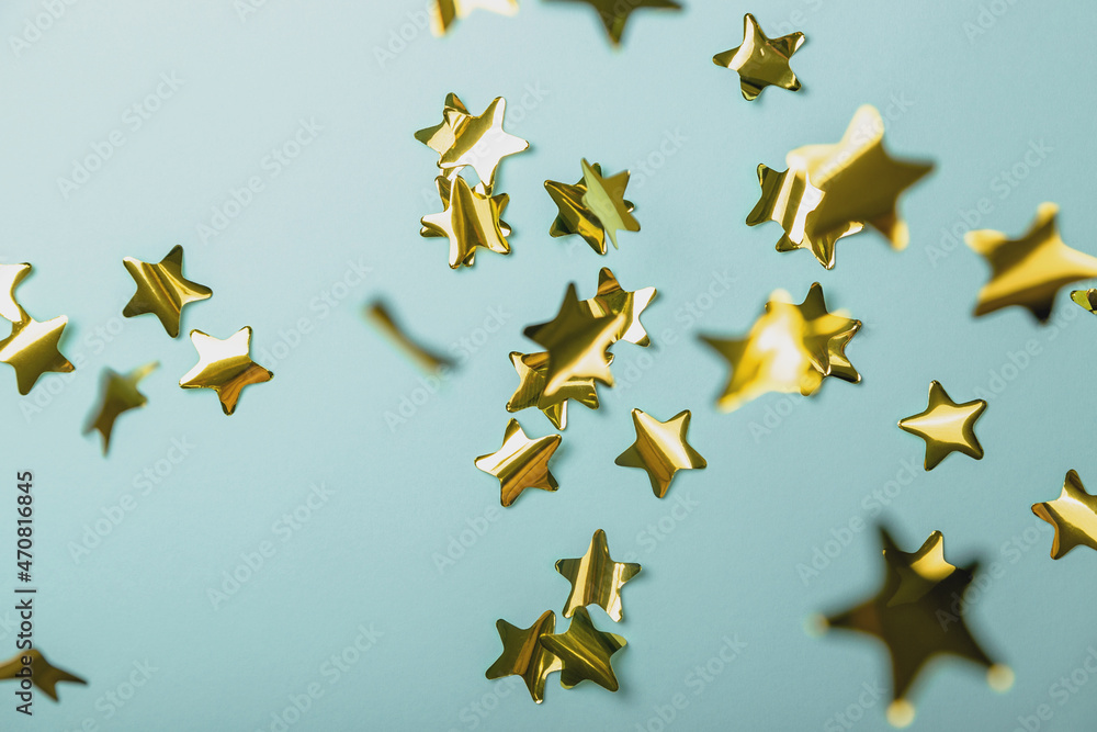 Background with flying gold confetti stars. Blue background. Wallpaper