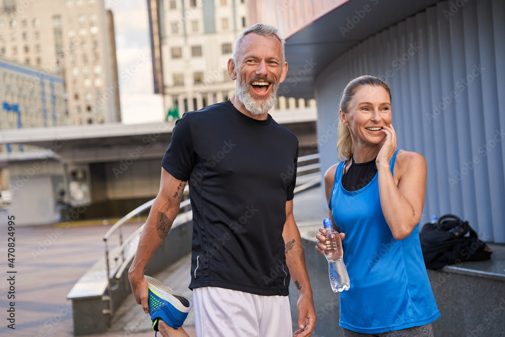 Portrait of happy sportive middle aged couple, man and woman in sportswear smiling, standing together outdoors ready for workout