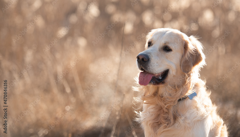 Closeup portrait of golden retriever dog sitting outdoors and looking back in early spring time in the field. Cute doggy pet labrador walking at the nature