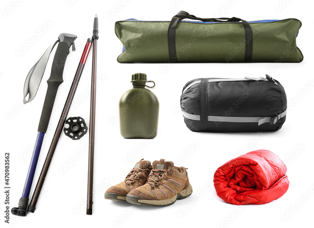 Set with different camping equipment on white background