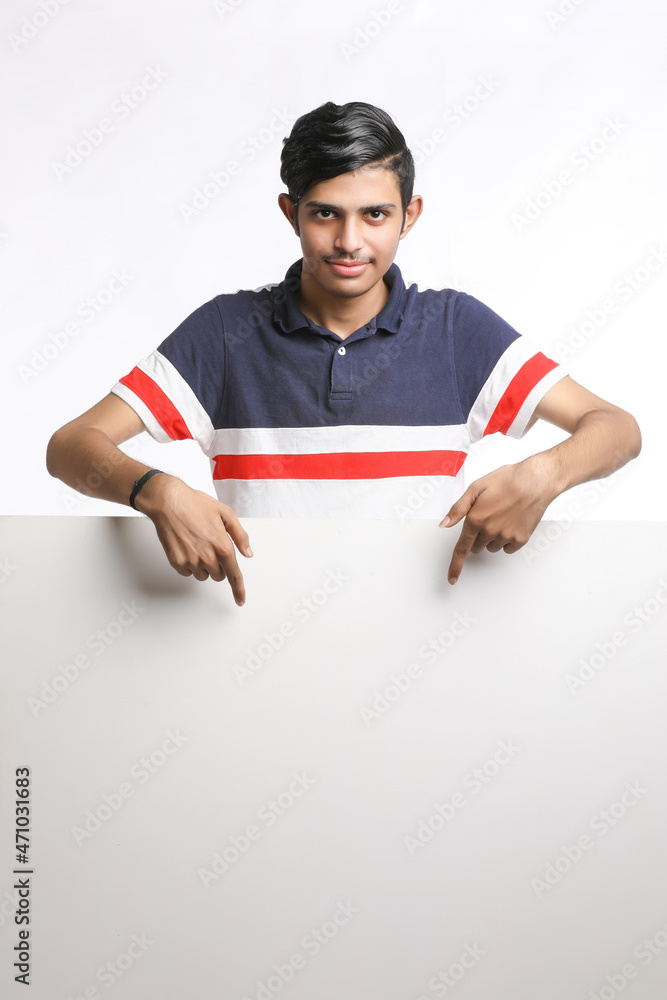 Young Indian man showing blank sing board over white background.