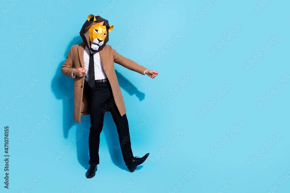 Full length photo of excited lion character guy dance theme festive event empty space isolated over blue color background