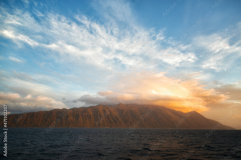 Chirip volcano at sunset, view from the sea. Iturup Island. South Kurils