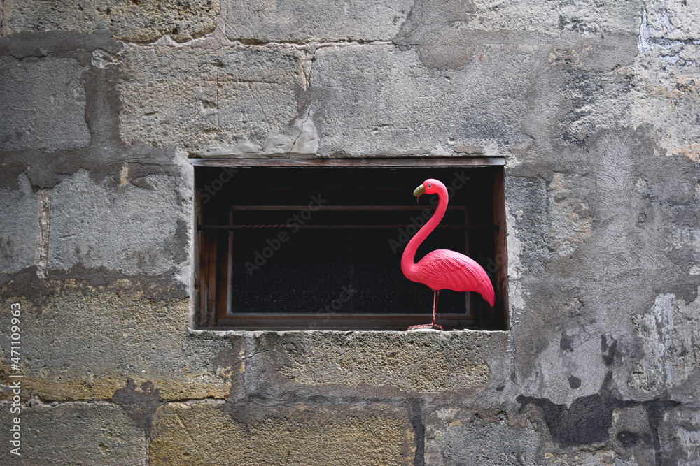 Artificial pink flamingo used as a decoration on the window. Surrounded by stone wall. Dada concept, background
