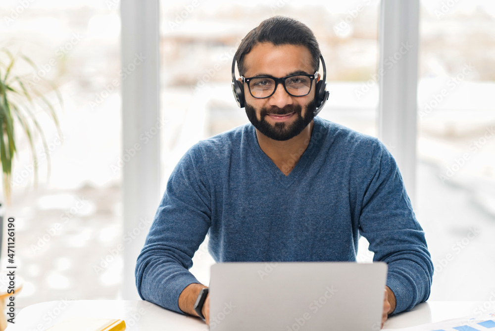 Indian male salesman in a headset is holding the call, ethnic customer service representative sitting in front of a laptop and looking at the camera