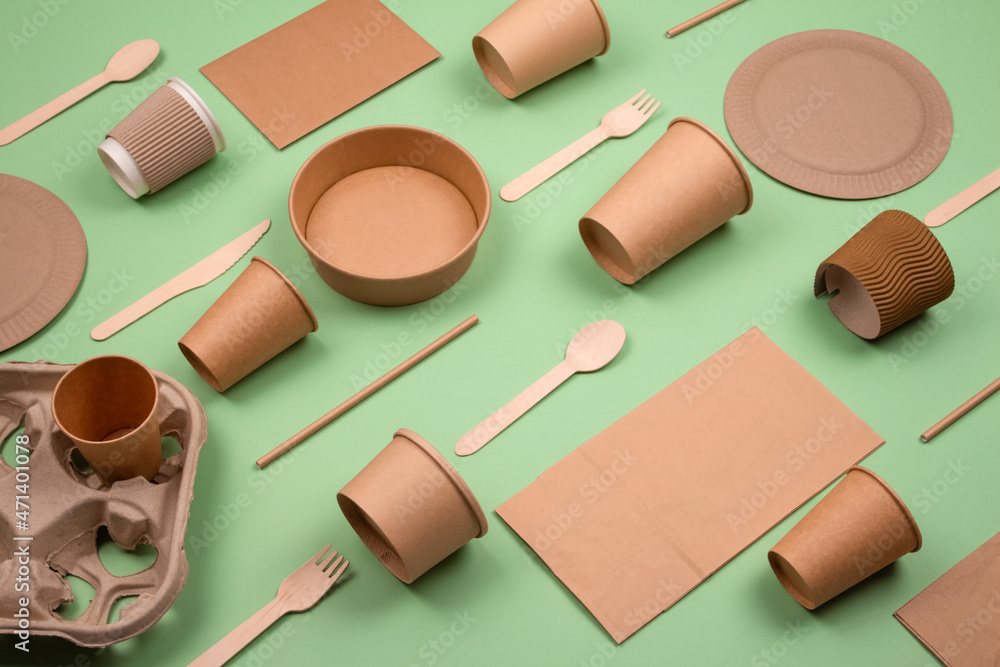 Set of different eco-friendly tableware and kraft paper food packaging on green background. Street food paper packaging - cups, plates, straws, containers, paper bags and wooden cutlery. Mockup