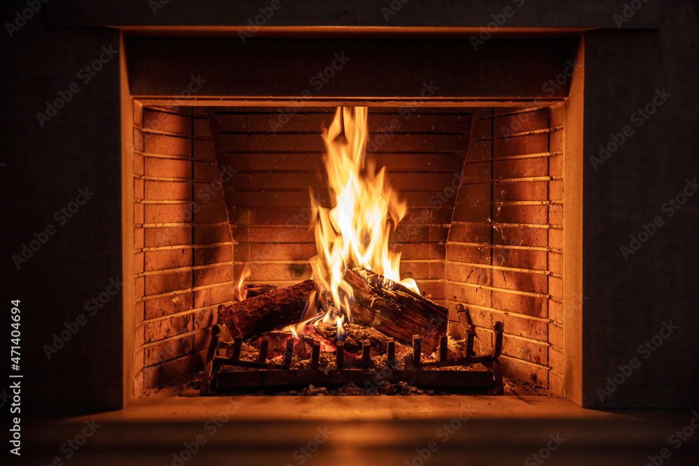 Fireplace burning firewood, fire flames on wood logs, bricks background. Cozy warm home at Christmas