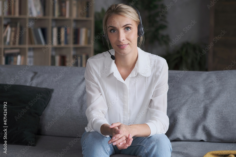 Portrait of blonde woman in headset talking online video call with friends studying online e learning distance education working remotely. Female in white shirt discuss deal with colleagues videochat