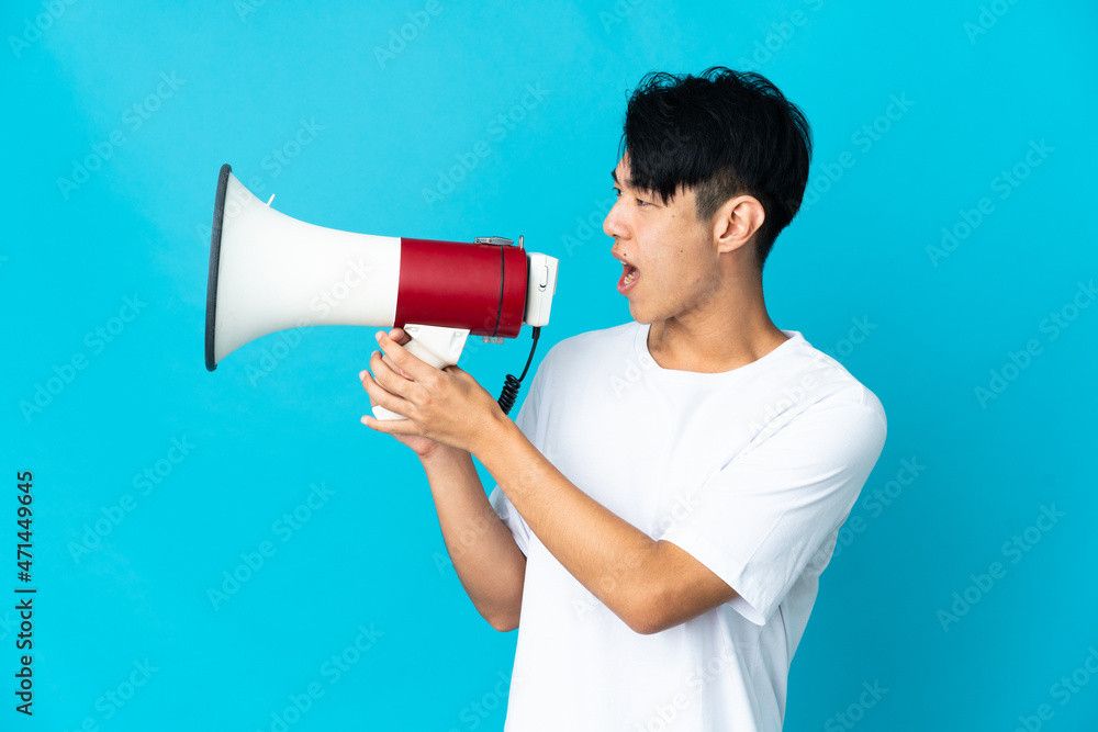 Young Chinese man isolated on blue background shouting through a megaphone to announce something in lateral position