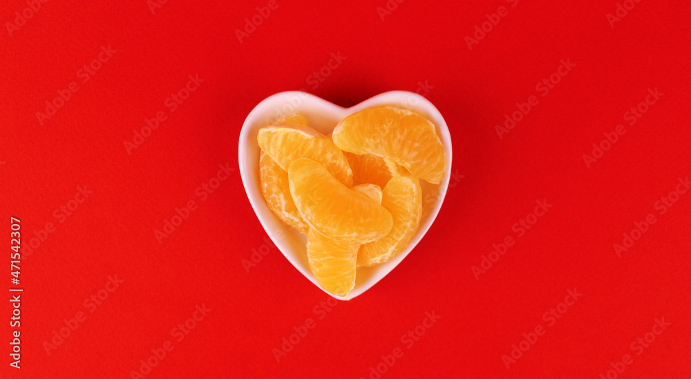 Slices of tangerine in a plate in the shape of a heart on a red background