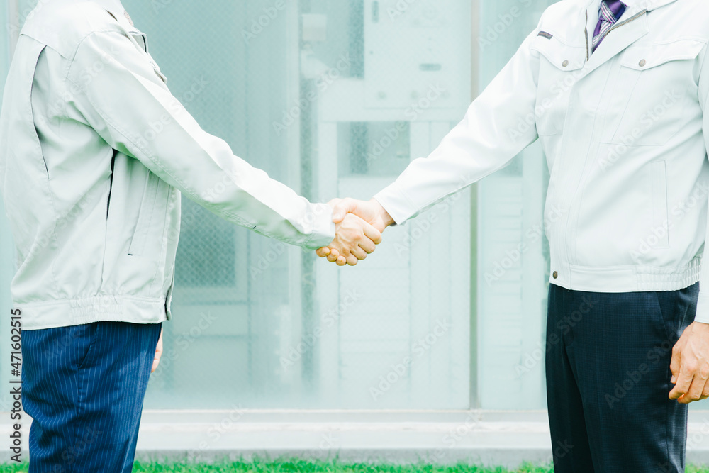 握手する作業着姿のビジネスマン(男性・顔なし)