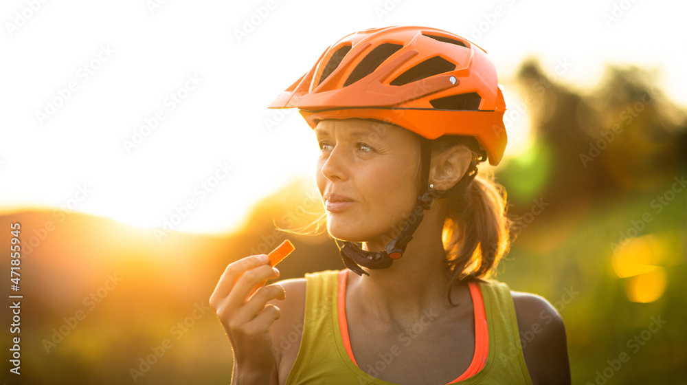 Young woman biking on a mountain bike enjoying healthy active lifestyle outdoors in summer - taking a break, eating a fruit gel (shallow DOF)