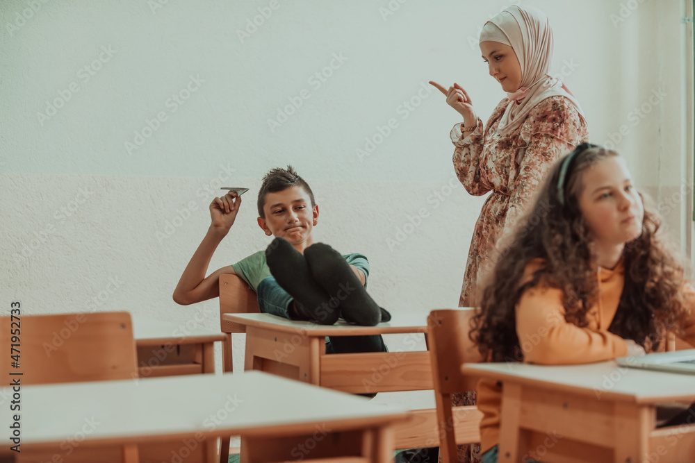 A naughty boy with his feet on a desk sits in the classroom and throws a plane. Selective focus