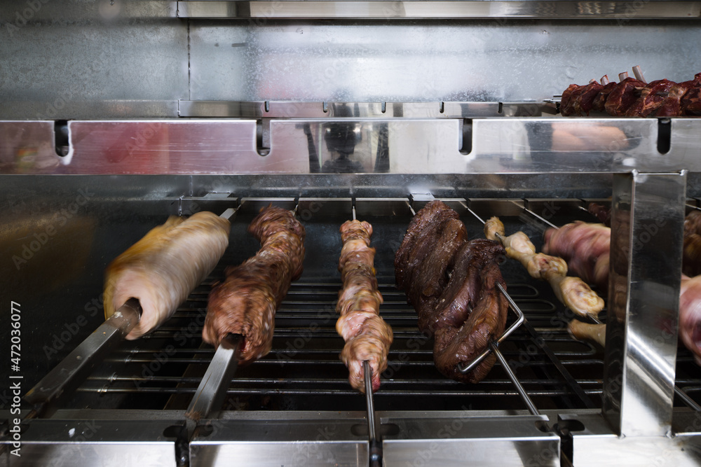 Different meats are cooked on skewers on electric grill in restaurant.