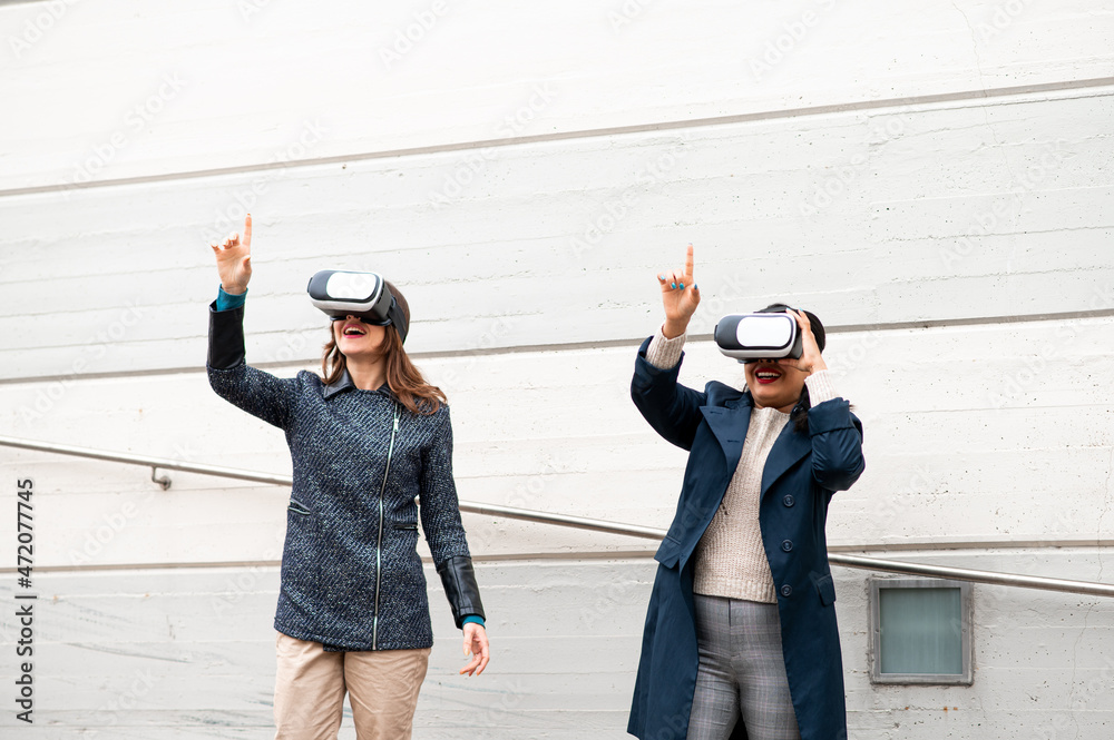 Two young women wearing virtual reality headset with city wall on background. Females have fun interacting and gesturing rising arms for something they are watching.