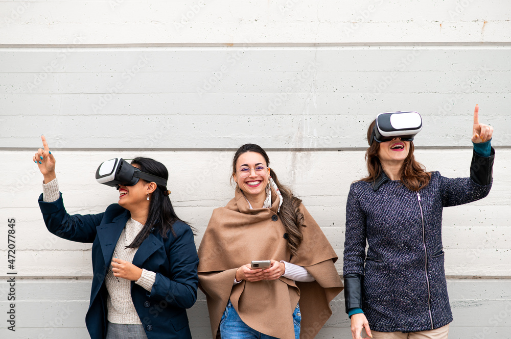 Young smiling woman looking at camera using smartphone between two happy women wearing virtual reality headsets. City wall on background with copy space. Future of technology.